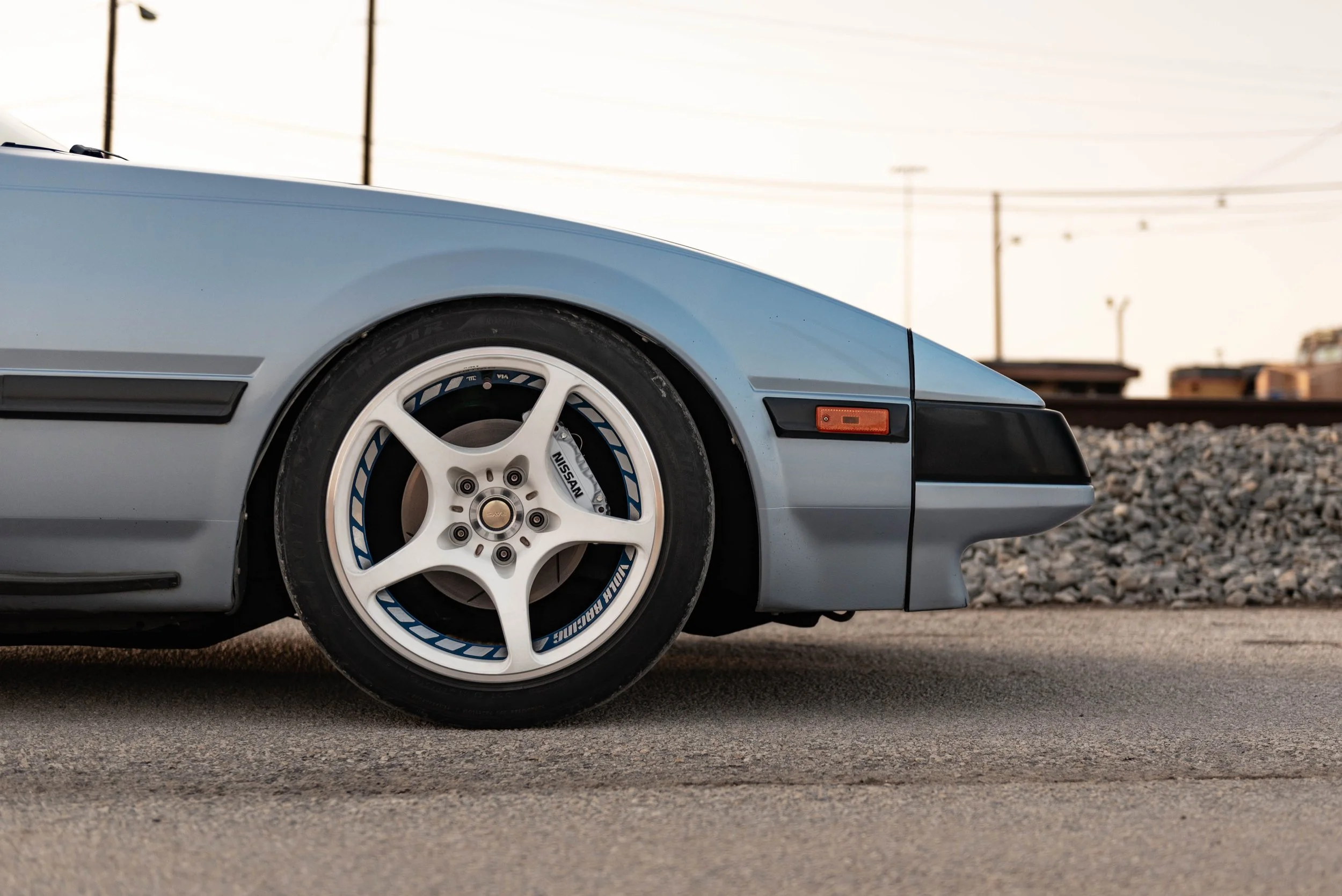 Eventually the parts accumulation began. The first initial stage of mods included a set of Powertrix coilovers, a 5-lug conversion, Z32 front brake calipers, and a set of Volk Challenge F-Zero Wheels. Caleb spent an entire weekend working with the coilovers, stripping the calipers down for a sleek gloss white powdercoat with black embossed letters, and a set of new piston seals and dust boots. He finalized the fitment with a set of 30mm spacers all the way around.